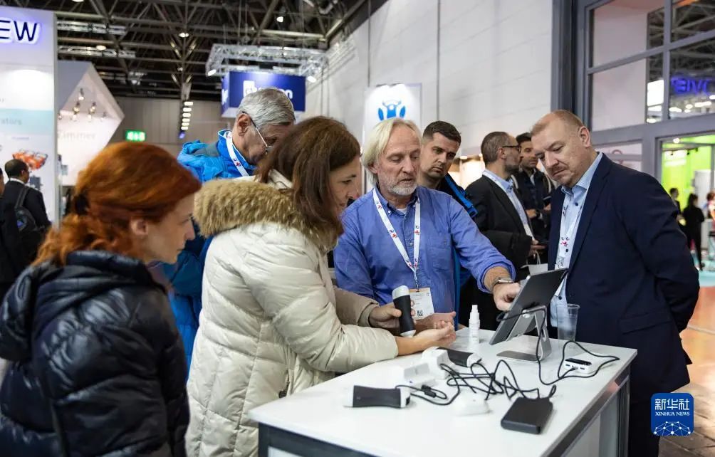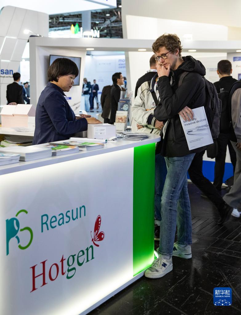 11月13日,在德国杜塞尔多夫国际医疗器械设备展,参观者在热景生物展位咨询洽谈。新华社记者 张帆 摄
