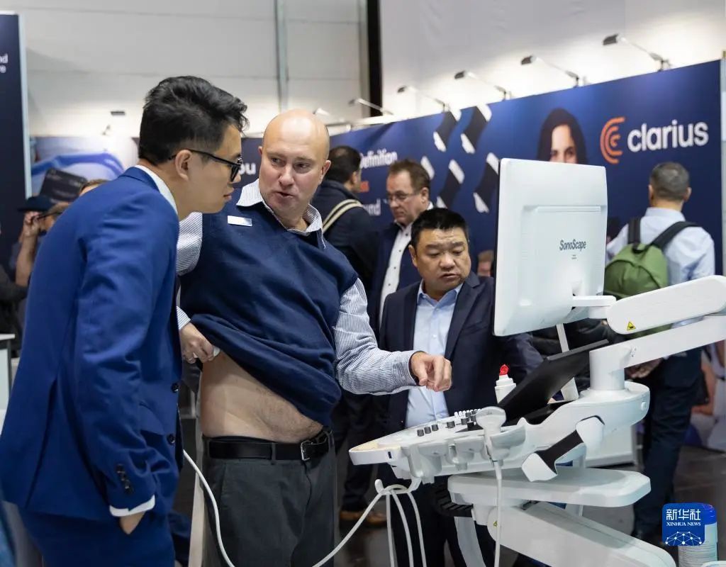 11月13日,在德国杜塞尔多夫国际医疗器械设备展,参观者在开立医疗展位体验超声设备。新华社记者 张帆 摄