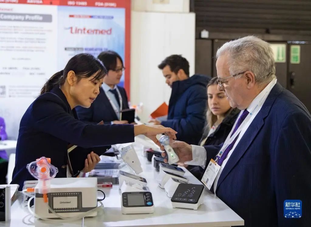 11月13日,在德国杜塞尔多夫国际医疗器械设备展,参观者在科曼医疗展位咨询洽谈。新华社记者 张帆 摄