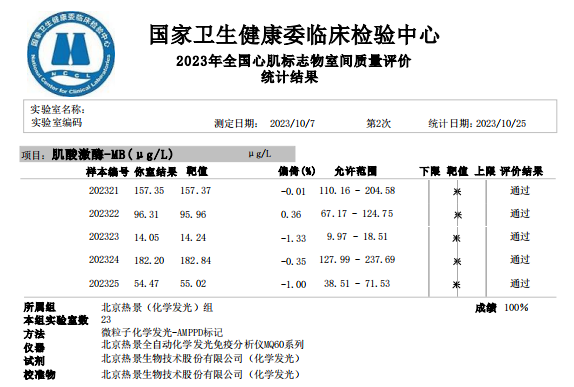 近日,国家卫生健康委临床检验中心(NCCL)公布了2023年第二次全国临床检验室间质量评价结果。经了解,热景生物心肌标志物(肌酸激酶同工酶、肌红蛋白、肌钙蛋白I)、血清降钙素原项目的上转发光及化学发光两大平台产品,以及D-二聚体、白介素6、胃蛋白酶原项目的化学发光平台产品均满分通过此次室间质量评价。同时,热景生物参与的上海临床检验中心2023年第二次能力验证活动,包括AFP异质体比率、B型钠尿肽/N末端B型钠尿肽前体、心肌标志物(肌酸激酶同工酶、肌红蛋白、肌钙蛋白I)、血清降钙素原等项目在内的产品均通过评价。