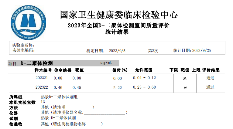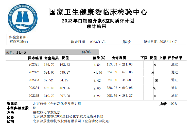 临床检验中心室间质量评价的结果可以反映出实验室管理水平和检测结果的准确性、可靠性和稳定性,而准确可靠的检测结果对患者的疾病诊断、治疗和预后判断都会产生直接影响。此次国家卫生健康委临床检验中心和上海临床检验中心组织的室间质评活动均通过质量评价,充分彰显了热景生物强大的产品以及技术实力。