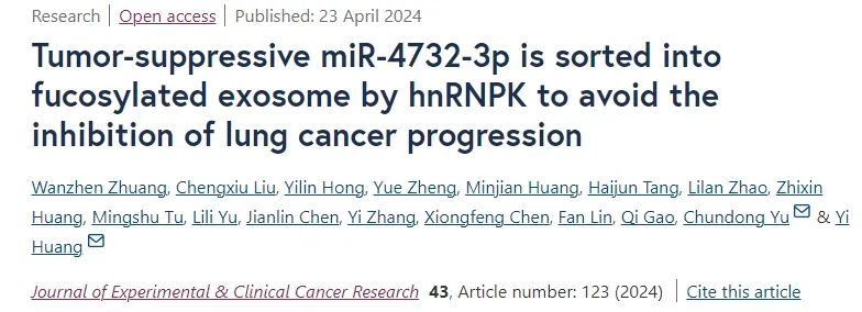 4月23日,福建医科大学研究团队在期刊《Journal of Experimental & Clinical Cancer Research》上发表了题为“Tumor-suppressive miR-4732-3p is sorted into fucosylated exosome by hnRNPK to avoid the inhibition of lung cancer progression”的研究论文,本研究为非小细胞肺癌提供了一个有前景的生物标志物,并通过靶向hnRNPK阻止miR-4732-3p从非小细胞肺癌细胞中“外泌体逃逸”,为非小细胞肺癌治疗开辟了一条新的途径。文章共同作者包括时博登陆高琦博士、刘城秀博士,热景生物作为合作单位为研究的实施提供了重要支持。