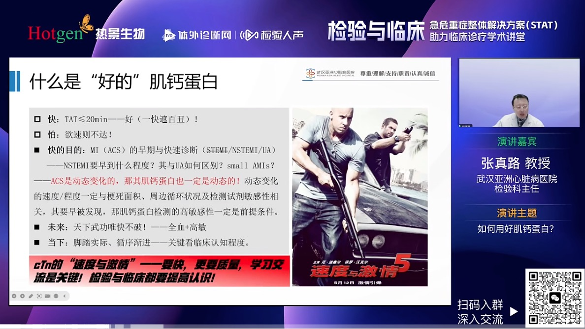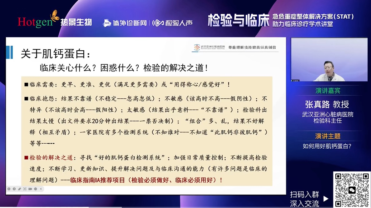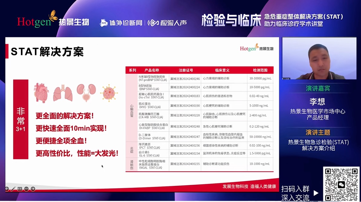 热景生物医学市场中心李想经理根据临床调研结果以及在急危重症多样化患者,分享热景生物完整的急危重症整体解决方案(STAT),并且分别阐述了不同场景匹配的解决方案,实现全血单人份10min准确报告出具,目前涵盖心脑血管、炎症以及肾损伤相关指标的全景解决方案,非常适用于胸痛中心、急诊、ICU等临床科室开展。