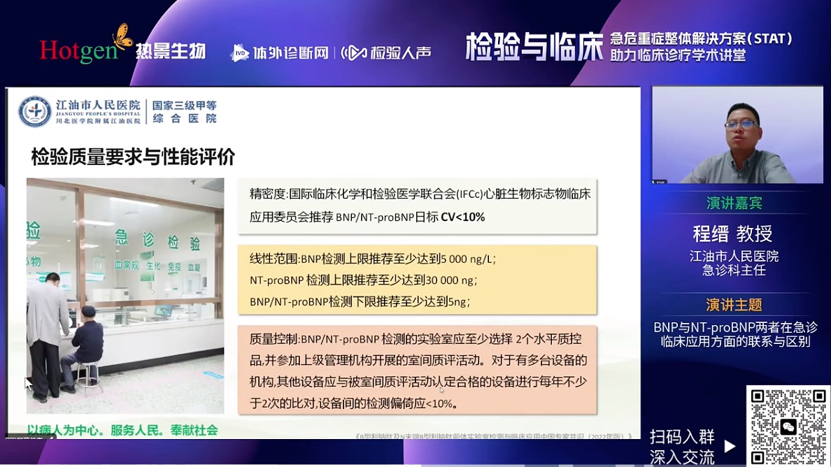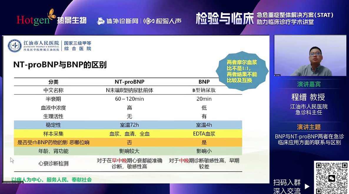 四川省江油市人民医院急诊科程缙教授就BNP与NT-proBNP两个指标进行了深入剖析,从BNP与NT-proBNP病理生理机制出发,解析了BNP和NT-proBNP之间的区别,全面的阐述了影响BNP和NT-proBNP水平的因素,又从检验角度强调BNP/NT-proBNP质量要求和性能评价。最后程教授回归临床分享BNP/NT-proBNP在心衰早期筛查与一级预防、心衰的诊断与鉴别诊断和心衰治疗监测和预后评估等临床价值。