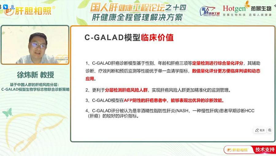上海交通大学医学院附属仁济医院嘉定分院检验科的徐炜新教授围绕肝癌早筛技术革新发表主题报告,他深入解析C-GALAD模型的临床价值与应用前景,为肝癌防控提供新策略。现状与突破----我国肝癌早期诊断率低,传统超声联合AFP检测对早期小肝癌敏感性不足。基于《海南省早期肝癌筛查实施方案》将“肝癌三项”(AFP、AFP-L3%、异常凝血酶原)纳入常规筛查,徐主任指出,多标志物联合检测成为破局关键:AFP-L3%提升恶性鉴别特异性,异常凝血酶原(DCP)反映肿瘤侵袭性,三者互补显著提高早诊效能。 C-GALAD模型:本土化创新典范----针对中国80%以上肝癌由乙肝驱动的人群特征,热景生物研发的C-GALAD模型,整合年龄、性别与“肝癌三项”定量数据,通过算法生成风险评分,实现三大优势:①精准分层:量化评分指导高危人群分级管理(如肝硬化患者每6个月联合超声筛查);②动态监测:评分变化早于影像学提示复发风险,助力疗效评估;③指南推荐:获《原发性肝癌诊疗指南(2024年版)》认可,成为辅助诊断核心工具。临床与政策协同---国内外指南均强调风险分层管理。徐主任呼吁推动“C-GALAD+超声”联合筛查普及,并展望未来融合液体活检、AI影像技术,构建普惠化早筛体系。