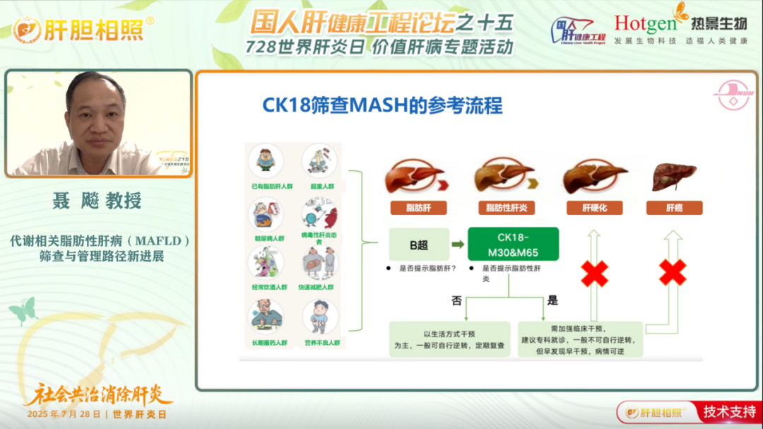 2025年7月28日是第15个世界肝炎日,今年我国的宣传主题是“社会共治,消除肝炎”。在世界肝炎日之际,由热景生物携手肝胆相照平台联合举办的“国人肝健康工程论坛”系列活动再度启程。本次直播以“以价值医疗驱动肝病全过程管理新实践”为主题,围绕价值医疗与肝病全过程管理核心逻辑,汇聚国内肝病领域顶尖专家,深入探讨肝癌早筛体系优化、代谢相关脂肪性肝病(MAFLD)精准管理、慢性乙肝临床治愈突破等关键议题,为临床实践提供前沿技术支撑与全周期解决方案。