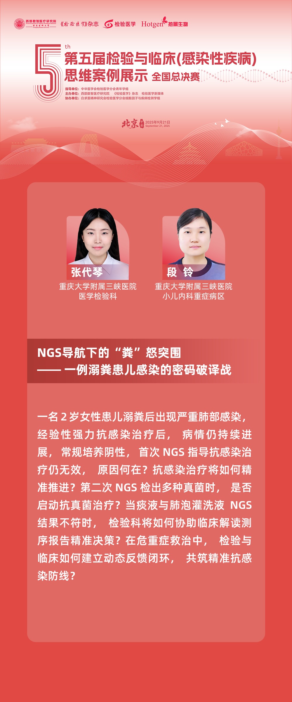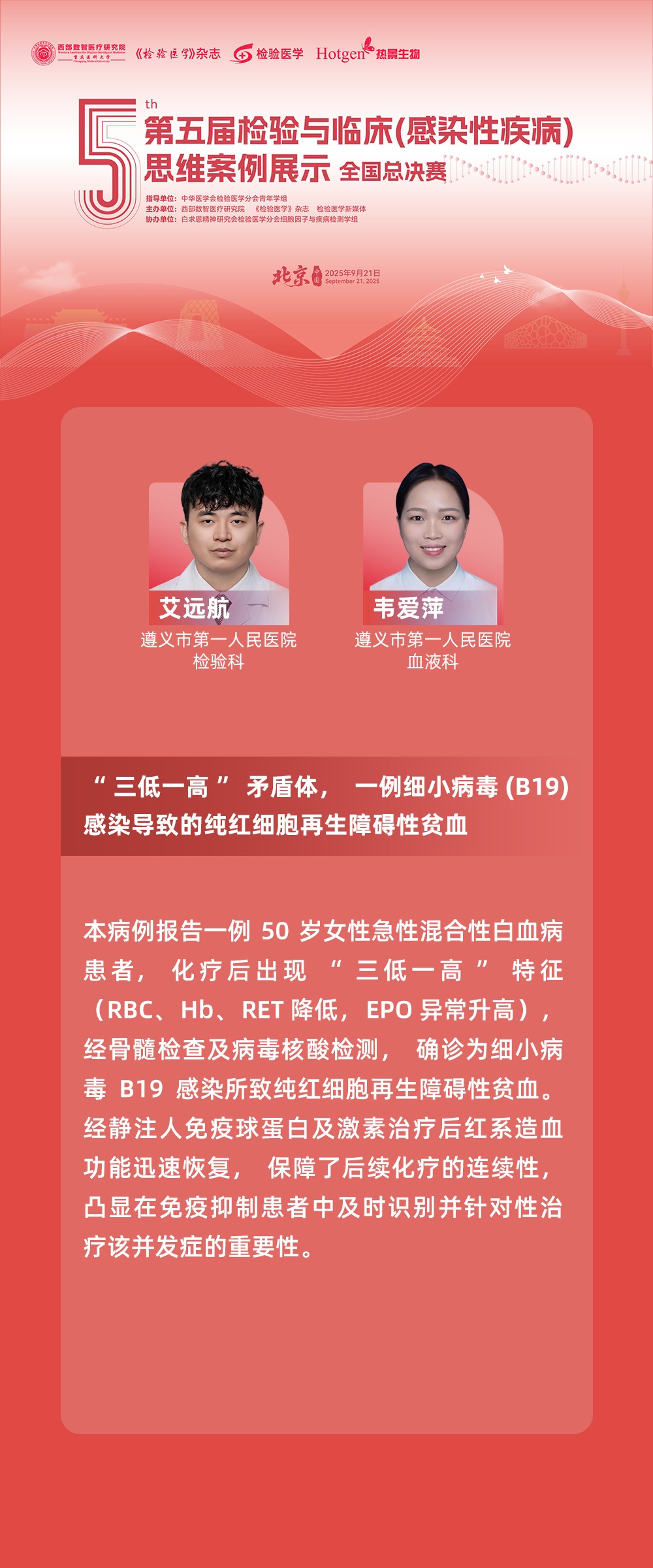 为了更有效地推进检验与临床之间的沟通,促进跨学科交流与合作,实现检验与临床的融合发展,在大会召开期间,举办了检验与临床思维案例展示活动暨“2025年全国检验与临床思维案例展示总决赛”。其中,由热景生物支持的“第五届检验与临床(感染性疾病)思维案例展示全国总决赛”冠军组案例,即来自遵义市第一人民医院的《“三低一高”矛盾体,一例细小病毒(B19)感染导致的纯红细胞再生障碍性贫血》、重庆大学附属三峡医院的《NGS导航下的“粪”怒突围——一例溺粪患儿感染的密码破译战》案例入选“2025年全国检验与临床思维案例展示总决赛”。