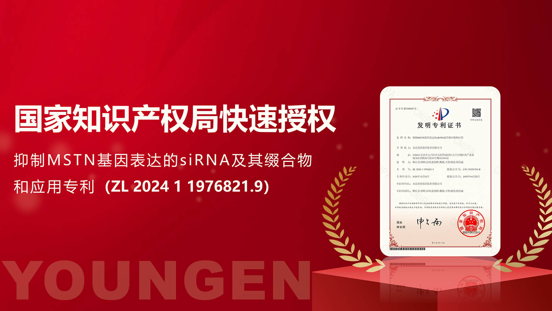 近日,热景生物参股公司北京尧景基因技术有限公司,被国家知识产权局快速授权了名为“抑制MSTN基因表达的siRNA及其缀合物和应用”专利(ZL202411976821.9)。该专利提供一种能够抑制MST...